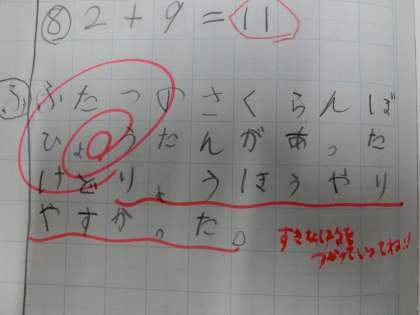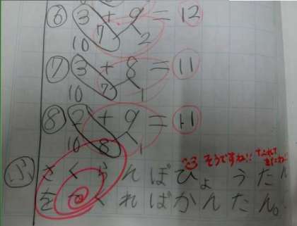 こどものふりかえりノートです。10を作るマークを形から「ひょうたんいけ」と子どもたちは読んでいます。「ひょうたんいけを作って考えるとできる!」と言っています。