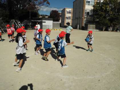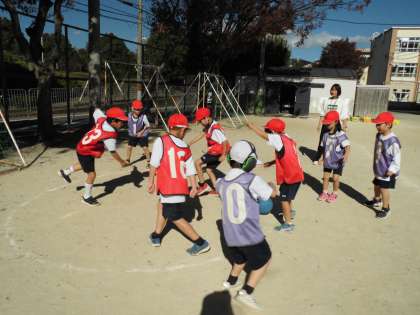 4つのコートに分かれてゲームをしています。同じチームと2回対戦。1回目の大戦の様子を考えた作戦が建てられているチームもあります。準備、後片付けも分担して頑張っています。