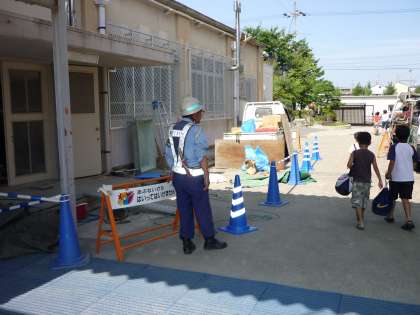 夏休み前にお知らせしましたとおり,ガス管の改修工事が始まりました。登校してくる子どもたちには,多少なりとも不便をかけていますが,工事業者の方には安全確保をしかっりとやっていただいています。