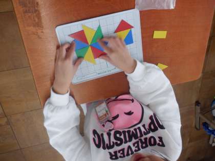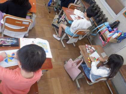 三角の色板を使って、いろいろな形をつくりました。いくつの三角がかくれているかな、三角が2つあると四角ができるぞと気づきをみんなに広めていました。