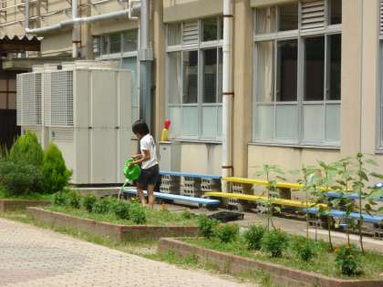今までは,雨が多くて水やりの必要もなかったのですが,この頃は気温がかなり上がって,土の中の水分がどんどん蒸発しています。園芸委員会の子が,学級園などの水やりに来てくれているので,植物も大喜びです。