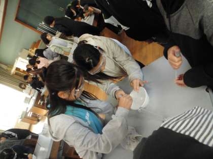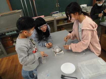 ものが溶けるにはどんな要素が関わっているのかを、予想をし実験を重ねながらみんなで考えています。