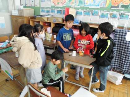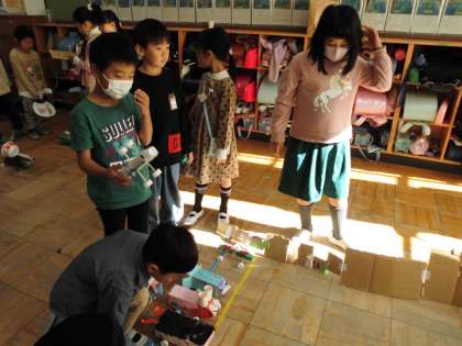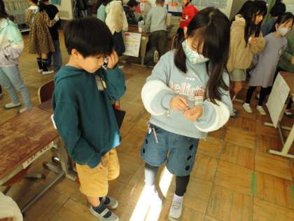 ペアの2年生に連れられ、いろいろなおもちゃコーナーを回り、楽しい時間を過ごしました。2年生の遊びの工夫やお店の人の言葉がけ、ペアの人のやさしさなどいろいろなよさを見つけていました。