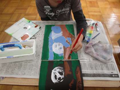 「絵の具は水を入れすぎず、乾かぬうちに」を確かめながら、