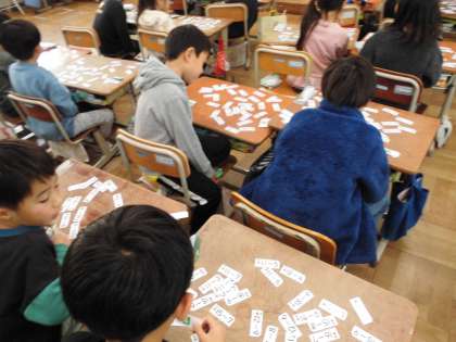 繰り下がりの引き算の練習をしています。カード練習をして同じ答えが何枚あるか、どうしたら早く計算できるかなどいろいろ自分たちで考えて取り組んでいると思います。お家でも練習の励ましをお願いします。