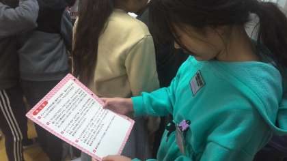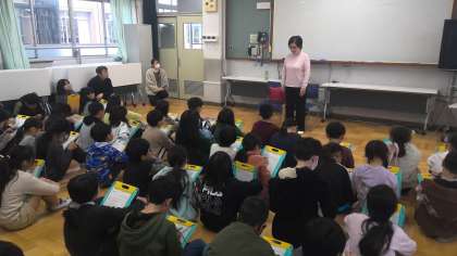 4年生の総合的な学習の時間の1つとして、京都市の「ほほえみ支援事業」を利用し、視覚障害のある方にゲストティーチャーとして来ていただき、生活や困り、点字といったことについて知る時間を設けました。