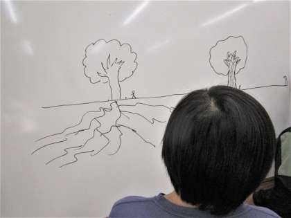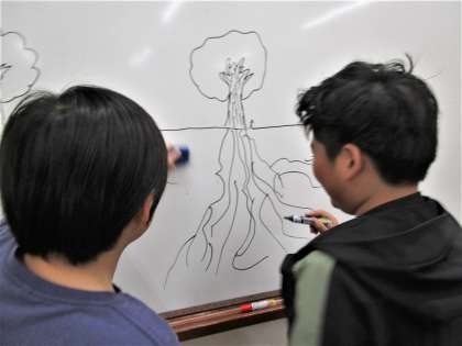 「木というのは、上に生えている枝や葉を支えるために、土の中でそれと同じぐらい根が広がって、水分や養分を送っているんだ。」という文をイラストで表現しているところです。