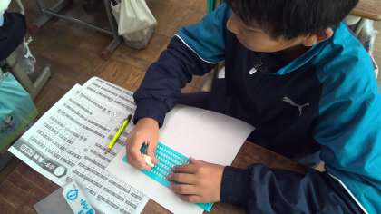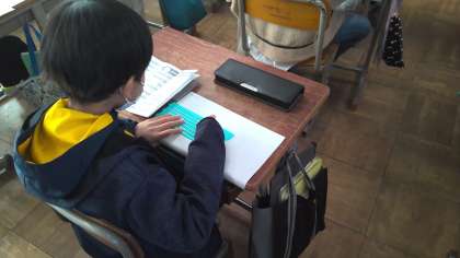 「笑顔があふれる桂川のまち」として、障害のある方について学んでいます。視覚障害のある方のお話を聞いて、点字に興味をもった子どもたちから「点字を書いてみたい!」との声があったので、体験しました。「難しいな」「あ!間違えた!間違えた時はどうしたらいいんやろう・・・」「難しいけど楽しいな」などいろいろな感想をもった子どもたちがいました。自分でうった点字をさわって「すごい!」「ほんまにできてる!」と嬉しそうな様子も見られました。