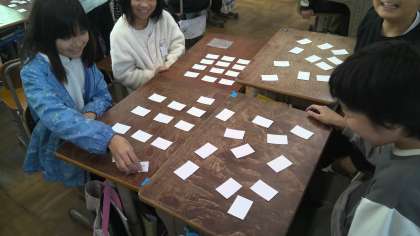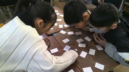 プレジョイントプログラムに向けて1・2学期の復習をしました。提示された問題に合う答えのカードを裏返しになったカードをめくりながら見つけます。学習内容をきちんと理解していることと、運も勝利の鍵になる楽しいゲームでした。ゲームをしながら子どもたちは「答えはわかってるのに〜!!」や「あれ?これで合ってたっけ?」と言って理科の学習の復習ができているようでした。