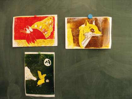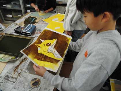 だんだん作品が出来上がってきて、子ども達を刷った後の版を見るときにドキドキしながら紙をめくっています。