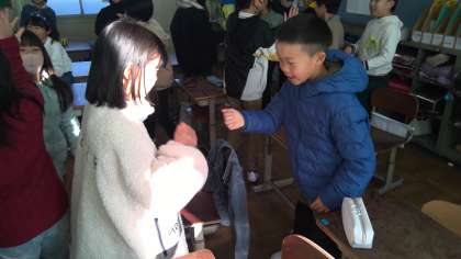 クラスの友だちと久しぶりに会った子どもたち。「なかよしじゃんけん」をしながら、「今年もよろしくね」とたくさんの人と関わりました。