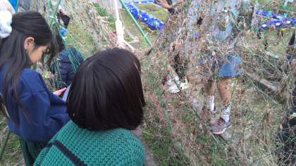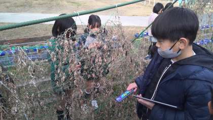 1年間観察してきたゴーヤを今日も観察しました。「めっちゃからから!」「種の入っているものと入ってないものでは、ふくらみが全然違う!」などよく見て観察をしていました。