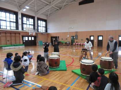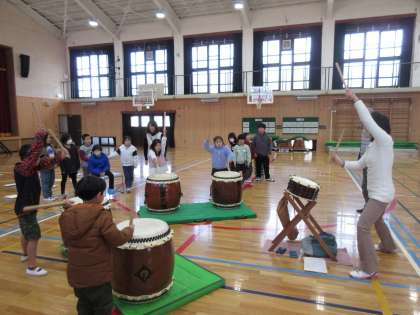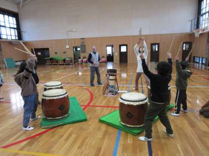 体育館に、太鼓のいい音が響きました。ばちの持ち方や姿勢も教えてもらいました。