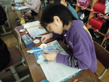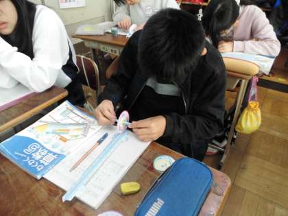 円周は直径の何倍になっているのかを、円周測定マシーンを使ってみんなで調べました。
