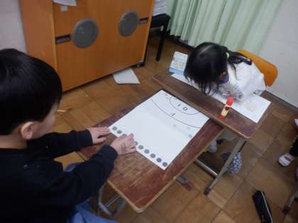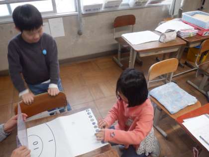 算数科の学習で,おはじきゲームをしました。「10が5つと1が2つで52や!」「10のくらいから比べたらどっちが大きいかわかりやすい!」と様々な気づきをしながら学習を進めていました。
