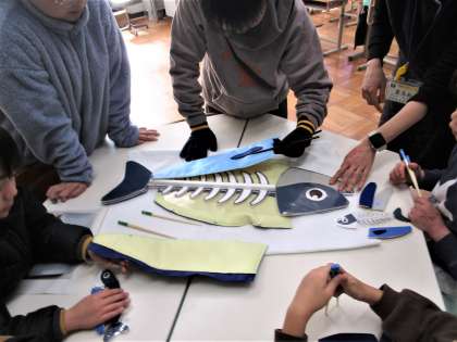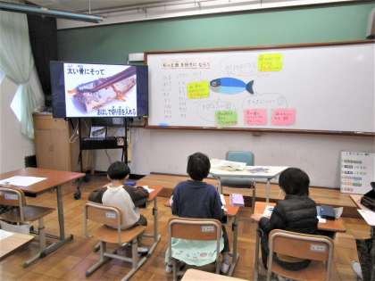 個別の教材を使用した後、いつのまにか後ろに置いてあった大きな魚の教材を使って、みんなで学んだことを確認しました。