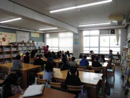 図書室での読聞かせ。みんな楽しんで聞きました。いつもどんなお話かなと子どもたち、楽しみにしています。