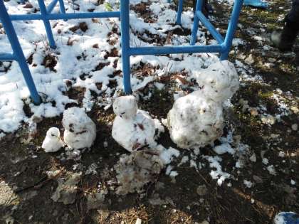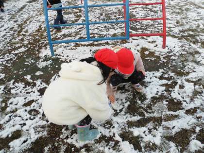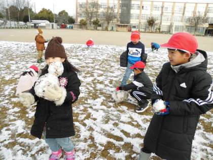 雪が芝生に積り、1時間目に雪遊びができました。みんな大喜びで雪を集めて雪遊びを始めました。雪だるまづくり、雪合戦、雪玉づくりなど、友達と一緒に楽しく活動しました。雪の冷たさを肌で感じながら進んで雪や友達とかかわって活動できてよかったです。