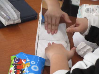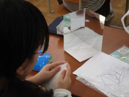 鏡に反射させることによってホールケーキに見えるように作っていました。