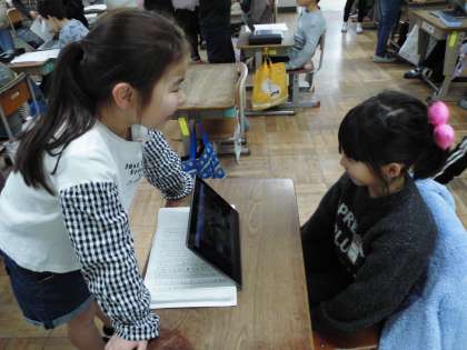2年生の生活科の学習発表を聞きました。タブレットに映し出された写真を見ながら2年生が発表する形で街のお店や施設について教えてもらいました。2年生でこんな学習があるんだなと楽しみになった子どもたちです。