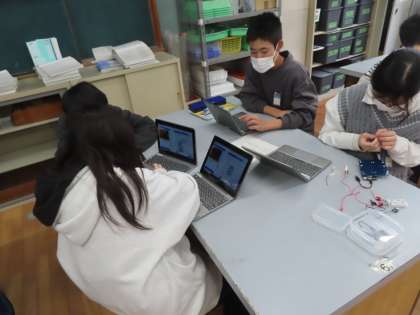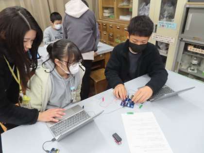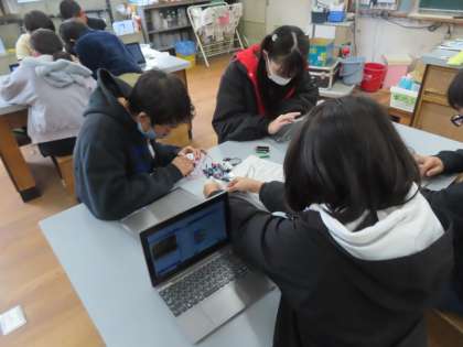 前回学んだプログラミングの知識を使って、様々な課題に挑戦。グループで協力しながら、どうすれば課題通りの動きをしてくれるか考えていました。