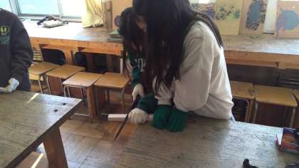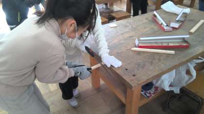 初めてののこぎりの学習。みんなドキドキしながらも「ギコギコギコギコ」・・・いろいろなところからリズミカルな音が聞こえてきました。