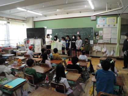 国語の学習で作成した本の紹介文を模造紙に貼りつけ、各学年にもっていきました。