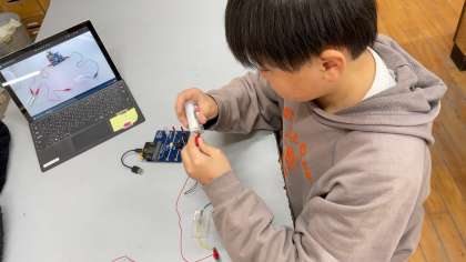 タブレットと実験機器をつなぎ、プログラミングの学習をしました。