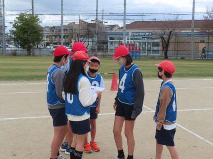 今回のサッカーでは、ハーフラインサッカーに取り組みます。チームでの作戦がとても大事です。ホワイトボードを使いながら、話し合っています。