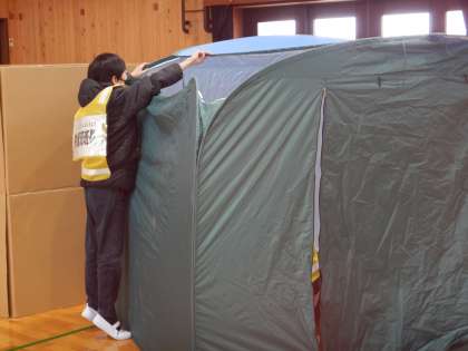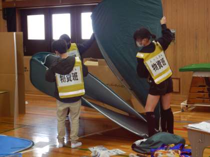 今日は、段ボールベッドやパーテーションの組み立てを体験しました。