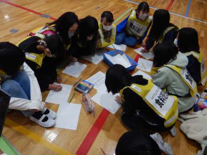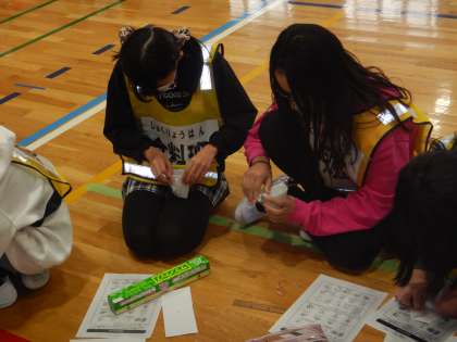 食料班の活動は、届いた食料をどの順番で配っていくのか、優先順位をつけその理由も話し合いました。後半は、紙でコップやお皿など作りました。