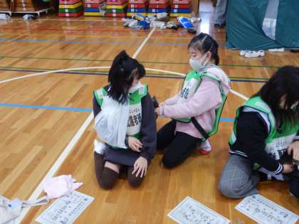 救護班では、実際にケガした時の応急手当の方法を学びました。