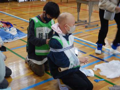 身近にある物を使って骨折の処置や、毛布を使って担架をつくったりしました。