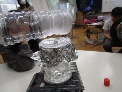 湯気にかくはん棒を当てたり、ペットボトルに集めて観察したりしました。