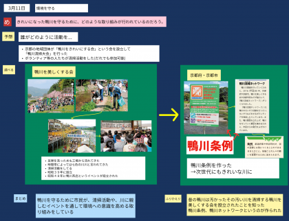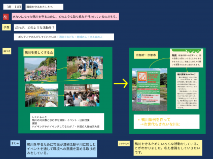 なぜ鴨川のきれいさは保たれているのか。誰がどのような活動をしているからなのかをみんなで考えました。