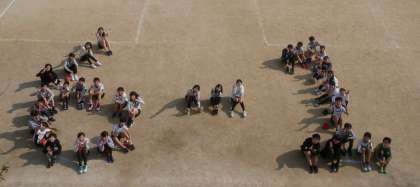 思い出に残すキーホルダー作りのためにクラスで人文字を作りました。完成が楽しみですね。