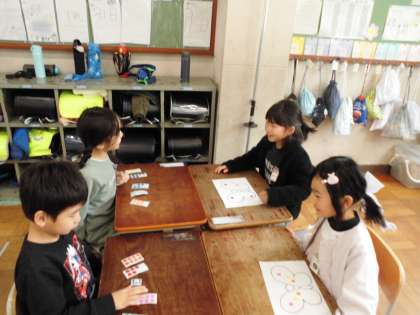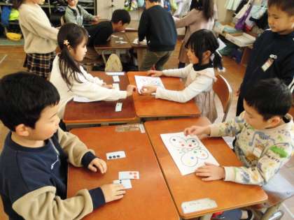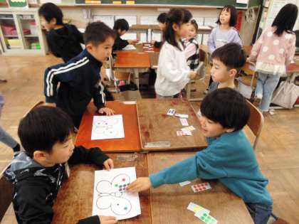 好きな色のシールをもらうために英語で伝い合いました。これまでの学習を生かして進んでお話ししようとする姿が見られてよかったです。自分の好きな蝶の模様になるように喜んでシール集めをしていました。