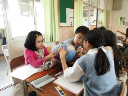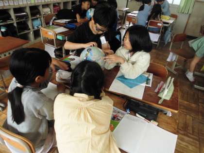 地球儀を使って、様々な国がどこにあるのかを探しました。