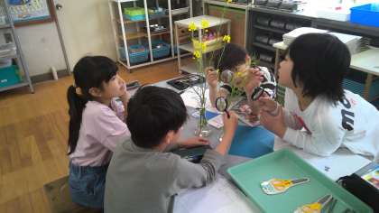 5年生理科の学習では虫眼鏡を使いアブラナの観察を行いました。めしべとおしべの花びらを、ピンセットで離し細かいところまで観察しスケッチができました。