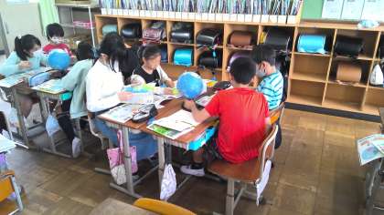 社会の学習で地球儀や地図を使って世界の国々の位置や国旗を調べました。友だちと協力しながら調べ、見つけた時には嬉しそうにしていました。