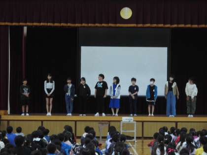 児童集会では,各委員長が委員会の紹介をしました。