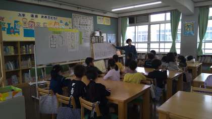 オリエンテーションを司書の大石先生からしてもらいました。ラベルの話も聞き、ラベルを見て本探しをしました。