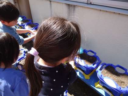 1年生はアサガオ、2年生はミニトマトを、自分の植木鉢でお世話します。