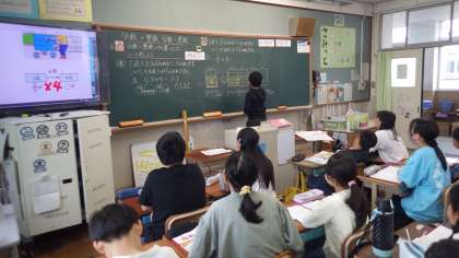 分数を整数でわったり、かけたりした時の答えはどうやって求めるのかを、面積図を使ったりしながらみんなで考えています。