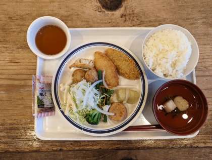 今日の献立は、ご飯とおつゆとフィッシュフライや揚餃子、ロールキャベツなどです。