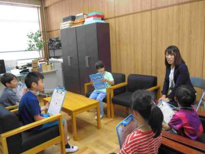 学校探検をして、もっと知りたいことをいろいろな先生にインタビューをしに行きました。