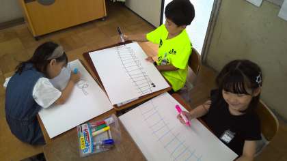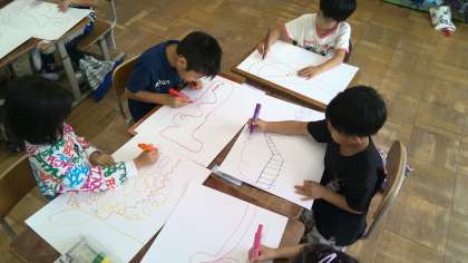大きな画用紙に一本のペンでいろいろな線を描きました。