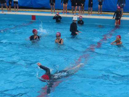 3年生では、プールの横を足をつかずに泳ぎ切ることを目標に、レベルごとに練習に取り組んでいます。