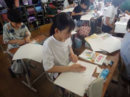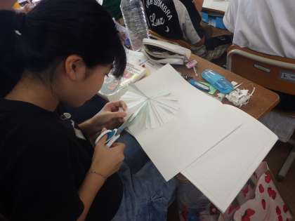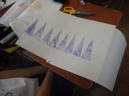 今日は、円をおうぎ形に切り取ってならべるとどんな形に近づいていくのかを、実際に作業をしながら考えました。