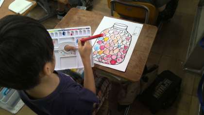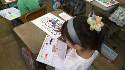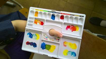 絵の具を使って、いろいろな色をつくりました。「赤と青まぜたら、紫になった!」「なんか茶色みたいな紫や!」など、子どもたちは、色の発見をたくさんしながら楽しんで絵の具を使っていました。